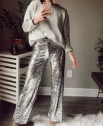 SEQUIN & Cashmere. The Key to keeping Sequin pants from being too over the top is pairing them with a top that is low key and soft. Try a Texture Clash and go with a Cashmere Sweater. Style with a French Tuck to add a casual elegance to your Sequin wide leg trousers. If you add any item on top that is too polished or too embellished you will have lost your focal point of the outfit. This look is an easy vibe for daytime or nighttime just be switching out the shoes and other accessories. I love an embellished shoe for Evening, Go for Stilettos, Booties or even Platform Heals.